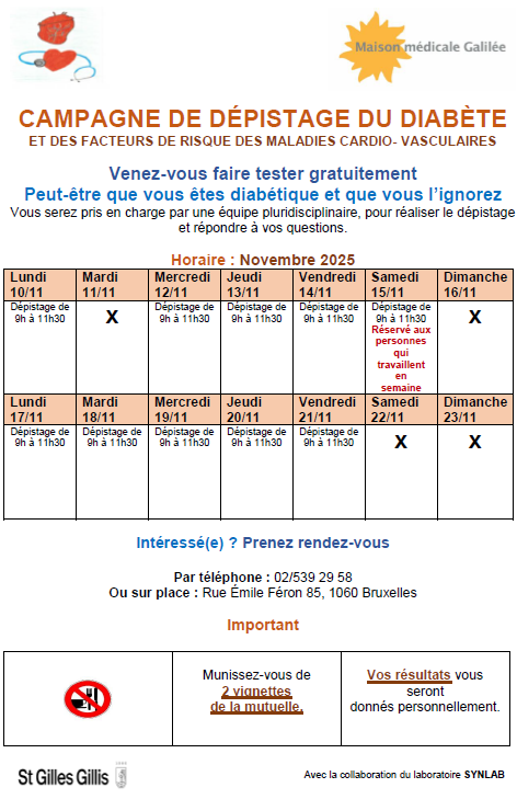 Notre campagne annuelle de dépistage du diabète sera organisée du 11 au 21 novembre. Prenez contact avec l’accueil si vous souhaitez prendre rendez-vous.
